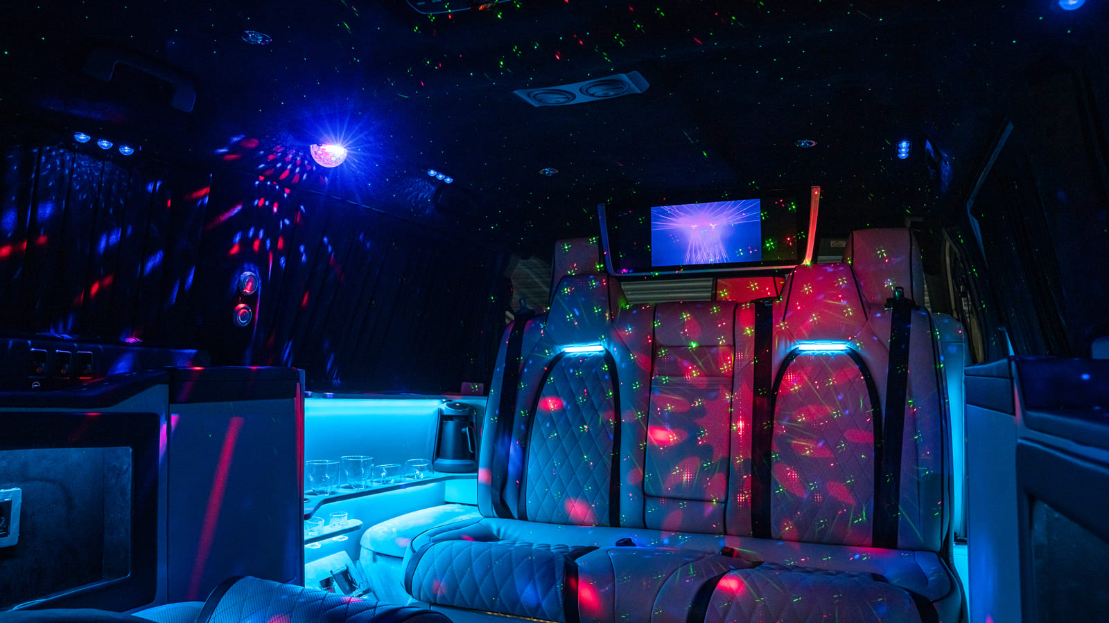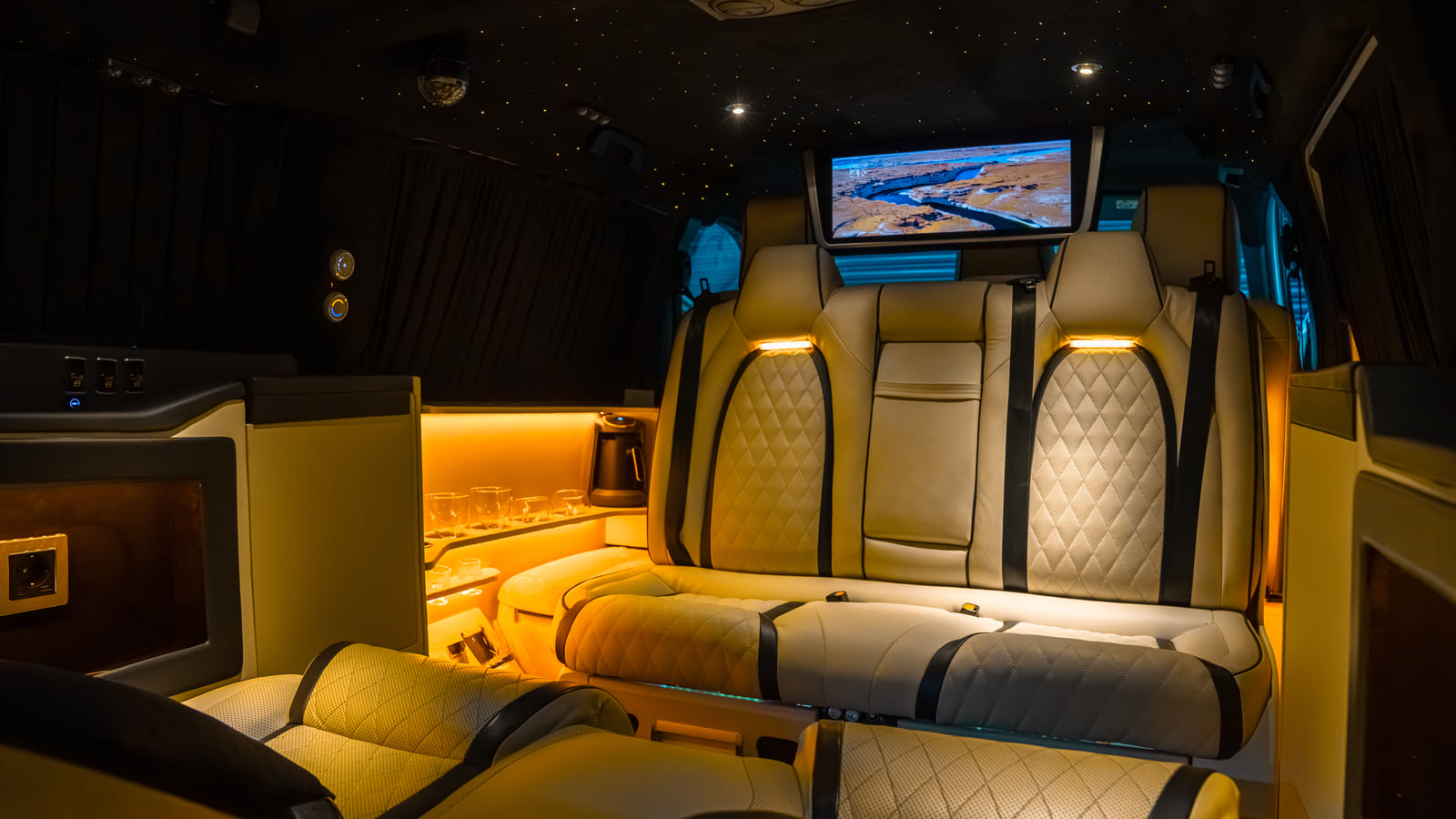 Eğlence araç tasarım modelinde özel tasarım, yolculuklarınıza eğlenceli ve benzersiz bir dokunuş katıyor. Beyaz ve siyah renk tonlarıyla modern ve zarif bir görünüm sunan araç içi dizayn, konfor ve eğlenceyi bir araya getirerek unutulmaz anlar yaşamanızı sağlıyor. Aykut VIP Dizayn’ın uzman ekibi tarafından özenle hazırlanan Volkswagen Transporter Eğlence araç tasarımı, yolculuklarınıza yeni bir boyut kazandırıyor.
